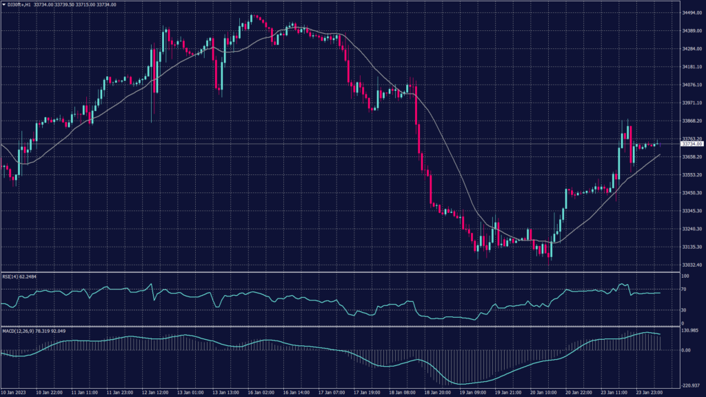 ارتفع مؤشر داو جونز في تداولات يوم أمس في ظل التفاؤل بشأن الاقتصاد العالمي وإعادة فتح الصين حيث ارتفعت شهية المخاطرة لدى المستثمرين ، فضلا عن تقارير أرباح المؤسسات المالية الكبرى الجيدة في الربع الأخير من السنة الماضية ، وفي ظل مخاوف العديد من الشركات لحدوث ركود محتمل أعلنت شركات كبرى مثل مايكروسوفت وجوجل وأمازون وغيرهم عن موجات تسريح للعمالة ، الأمر الذي سوف يؤدي لإبطاء سوق العمل مما قد يدفع التضخم للتراجع قليلا.
