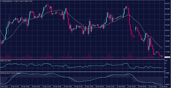 انخفض سعر الخام الامريكي حوالي 2.5 دولار بدءاً من تداولات يوم أمس ليلامس مستويات 77.5 دولار مع ضغط من البائعين، بالاضافة الى تواجد زخم سلبي قوي على المؤشرات الفنية مما يبقي السعر تحت الضغط لحين صدرو أي أخبار إيجابية تنقذ الاسعار.