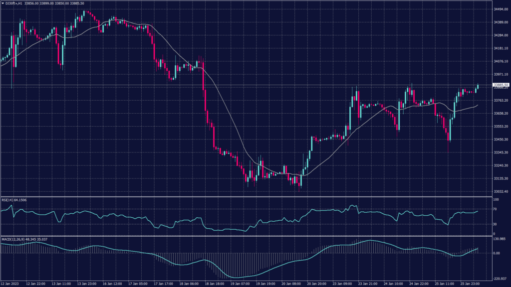 استقر مؤشر داو جونز في ختام تداولاته يوم أمس بعد أن محى معظم خسائره التي تكبدها خلال الجلسة ، وجاء ذلك على خلفية ارتفاع شهية المخاطرة لدى المستثمرين نتيجة صدور نتائج الأعمال الفصلية الجيدة الصادرة من الشركات الكبرى ، فضلا عن تفاؤل السوق لإعادة فتح الصين بعد الإجازة السنوية بمناسبة رأس السنة الصينية والتي من المتوقع أن تزداد حركة الإنتاج بعدها مما يزيد حركة الطلب في الواردات والصادرات ، ويترقب السوق اليوم بيانات الناتج الإجمالي المحلي في الولايات المتحدة الأمريكية للحصول على معلومات بشأن الركود.