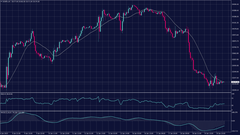 انخفضت قيمة مؤشر داو جونز حوالي 290 نقطة في تعاملات العقود الفورية يوم أمس وفشل السعر في الثبات أعلى نقطة المحور مما ضغط على السعر للوصول الى مستوى الدعم القائم عند 33,000 ويظهر ضغط بيعي على مؤشر MACD مما يمهد لمزيد من الهبوط ، بينما يظهر التشبع البيعي على مؤشر القوة النسبية مما يمهد لحركة تصحيحية ، وينظر السوق اليوم خطابات أعضاء الفيدرالي للحصول على تلميحات بشأن سياسة الفيدرالي.