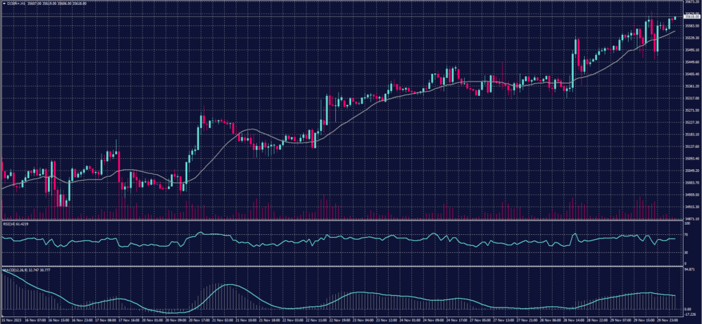 و ارتفع مؤشر الداو جونز بنسبة 0.04% أي ما يعادل 13 نقطة لتصل المكاسب منذ بداية نوفمبر إلى 7% متجهاً لتحقيق أعلى مكاسب شهرية منذ أكتوبر 2022، بينما انخفض مؤشر ناسداك بنحو 0.2% وتراجع مؤشر S&P 500 بأقل من 0.1% ولكنه ظل مرتفعاً بأكثر من 8% منذ بداية نوفمبر الحالي متجهاً لتحقيق أعلى مكاسب شهرية في 16 شهراً .