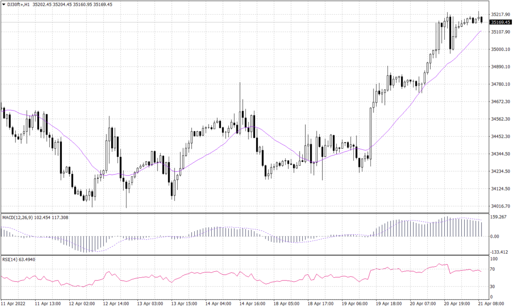 نظرًا لارتفاع قيمة المؤشر بعيداً عن مستوى الدعم الأخير عند 34,130، يظهر مؤشر داو جونز على الرسم البياني اليومي اتجاهاً صعودياً. وبالمثل، يظهر الرسم البياني للساعة أن المؤشر يشكل ارتفاعات جديدة وصلت إلى أعلى مستوى منذ 30 مارس. يُظهر مؤشر القوة النسبية أن مؤشر DJ30 بقي مدعوماً بمستوى المقاومة المتكون تحت 34,350. في غضون ذلك، يُظهر MACD تباطؤاً في الزخم دون التخلي عن الاتجاه الصعودي.