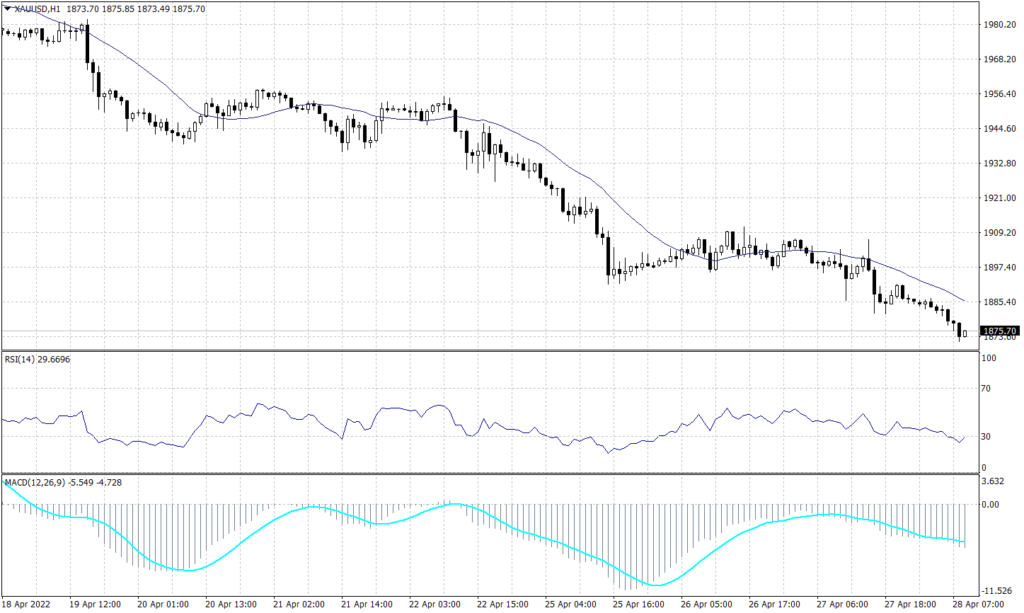 سيطر التوجه الهابط على المعدن النفيس، حيث اخترقت أسعار الذهب مستوى الدعم الصعودي تحت 1,900. يشير الرسم البياني لكل ساعة إلى استمرار نحو 1,850، بينما تشير الرؤية الفنية على المدى الطويل إلى 1,800 بناء على ميل الرسم البياني.