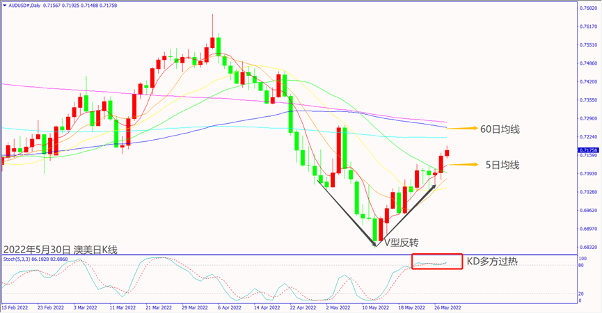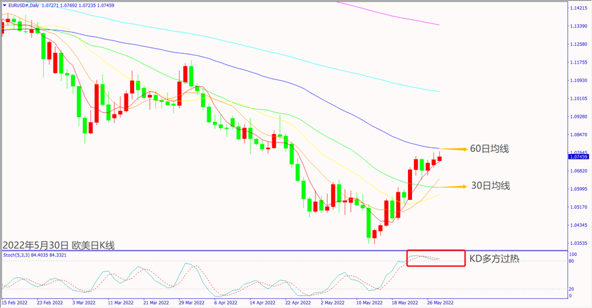 日级别线图,近期连续上涨KD多方过热, 60日均线冲不过,可能回测30日均线。