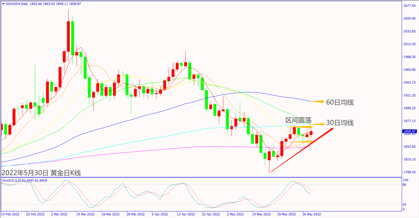 日级别线图,近期在1840~1870区间震荡,一旦突破30日均线,可能挑战60日均线。