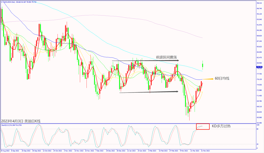 上周日(2日)晚上OPEC+意外宣布大幅减产,本周一(3日)早上美油价格跳空上涨近9%。预期本周一(3日)美国公布制造业数据利好,以及本周二(4日)欧元区公布PPI下降利淡加息,利好欧美股指可能推升美油价格再度冲高。预期本周三(5日)美国ADP就业数据下降,以及预期本周五(7日)美国公布非农数据不佳,利淡欧美股指下跌,不排除拖累美油价格回测60日均线。