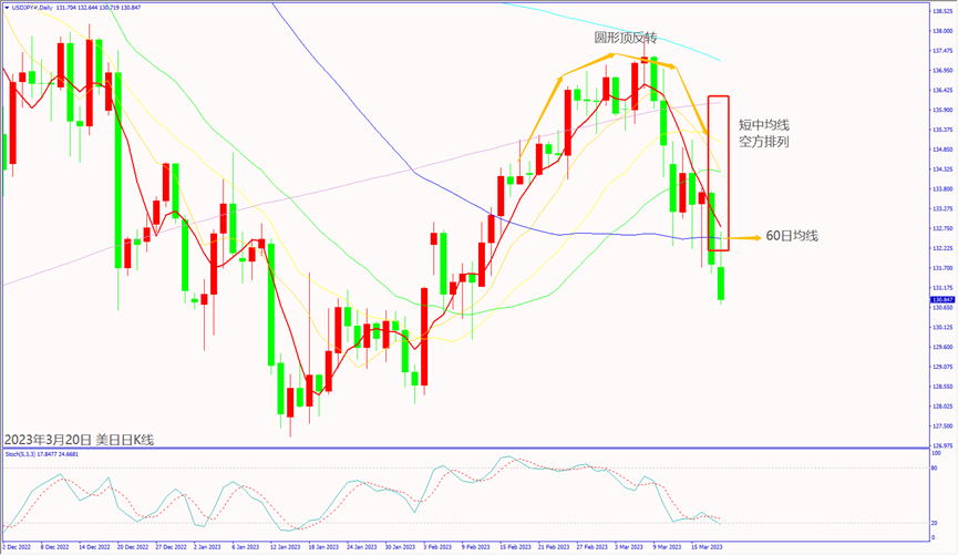 日级别线图,圆形顶反转,短中均线空方排列,可能延续下跌走势。