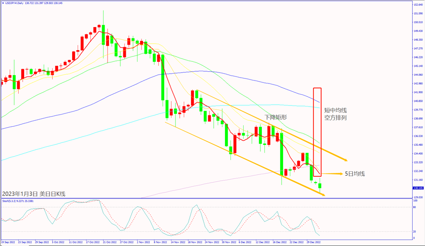 日级别线图,出现下降矩形空方走势,5日均线冲不过,可能延续跌势。