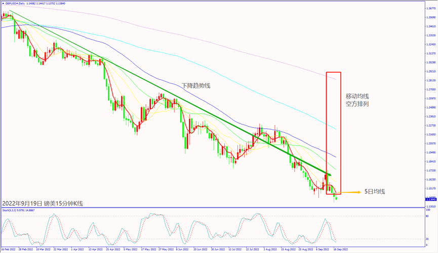 日级别线图,连续下跌创20年新低,移动均线空方排列,可能下探新低。