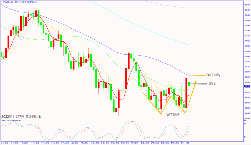 日级别线图,出现W底反转,一旦突破60日均线,不排除上看1700美元。