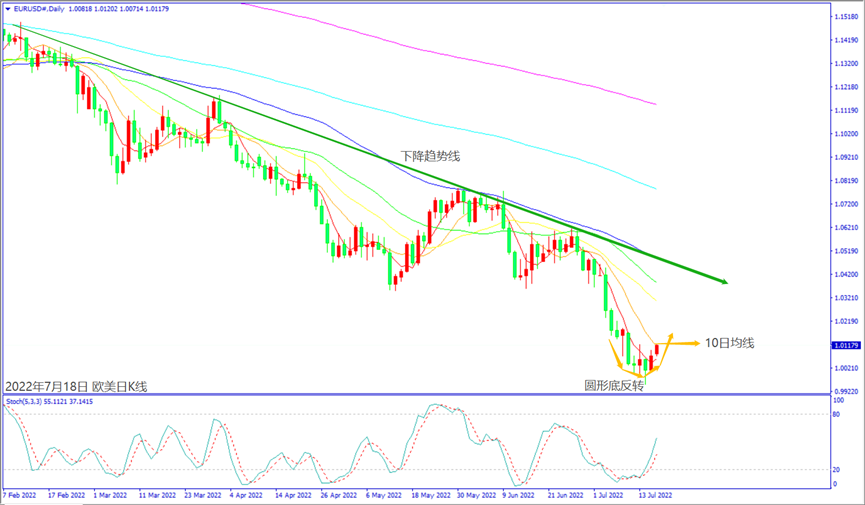 日级别线图,出现圆形底反转,一旦突破10日均线,可能挑战下降趋势线。