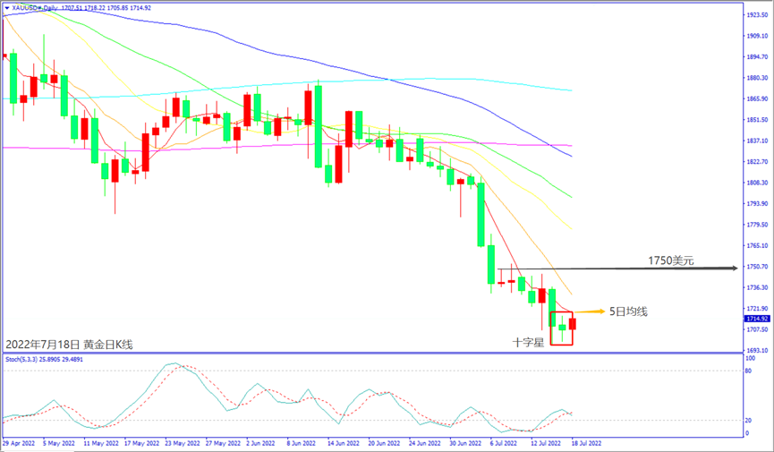 日级别线图,十字星反转信号,一旦突破5日均线,可能挑战1750美元。