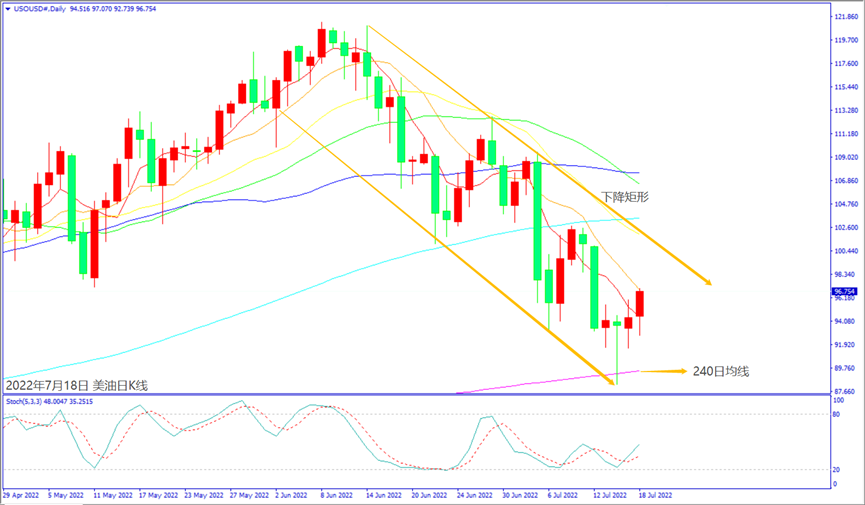 昨天(17日)传出美军在叙利亚东北部转运盗采石油,带动本周一(18日)美油价格急涨冲上97关口。预期本周二(18日)至本周四(21日)欧洲各国公布CPI和欧洲央行宣布加息,一旦造成欧美股指大跌,可能拖累美油价格回测240日均线。预期本周五(22日)美国公布经济数据利好,有望带动美油价格再度反弹。