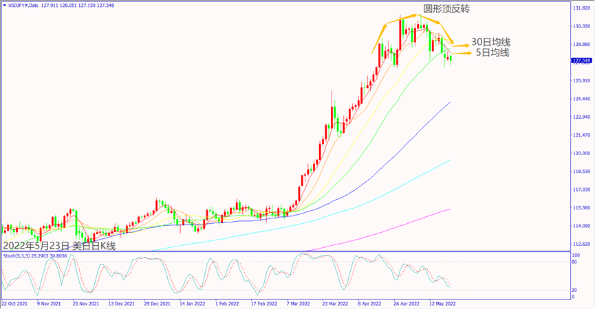 日级别线图,连续下跌出现圆形顶反转,5日均线反压,可能延续跌势。
