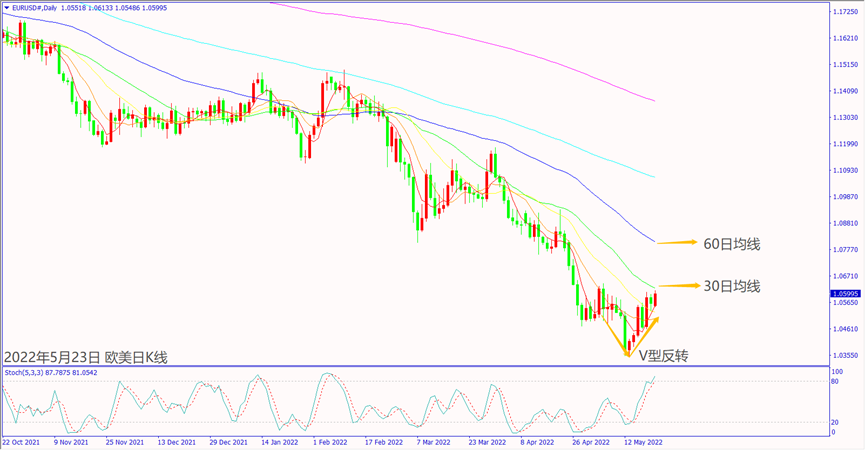 上周二(17日)欧元区公布第一季度GDP好于市场预期,以及美国财长耶伦称经济不会衰退,带动欧美股指大涨创一周来新低。上周三(18日)多位美联储官员预期6月加息50个基点,以及上周四(19日)美国公布经济数据利淡,造成道琼斯和纳指暴跌超6%。上周五(20日)欧盟官员称欧洲经济面临温和衰退,造成欧美股指皆出现大跌,上周六(21日)清晨意外出现扎空盘收复跌势。