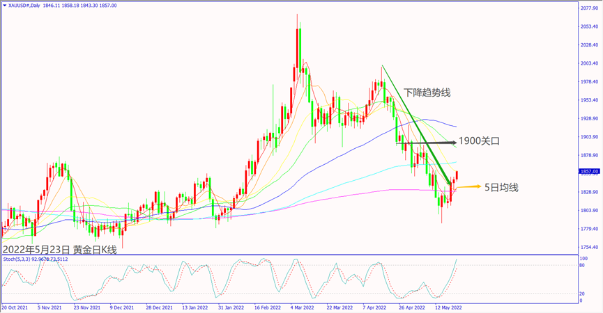 日级别线图,连续上涨突破下降趋势线,守住5日均线,可能挑战1900美元。