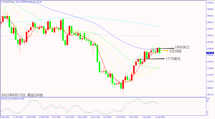 日级别线图,近四天在1800关口附近震荡,一旦掼破5日均线,可能回测1770美元。