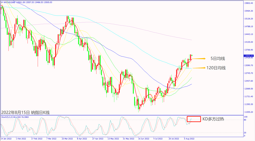 日级别线图,连续上涨KD多方过热,一旦跌破5日均线,可能回测120日均线。