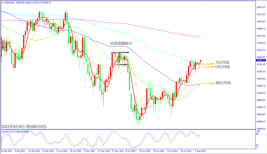 日级别线图,前波起跌阻力前盘涨,一旦跌破5日和10日均线,可能回测60日均线。