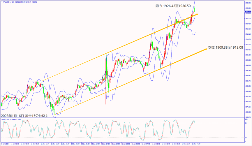 日级别线图,连续上涨KD多方过热,1920.00关口若跌破,可能回测5日均线;15分钟K线,出现上升矩形,上方趋势线冲不过,不排除回测前低支撑。