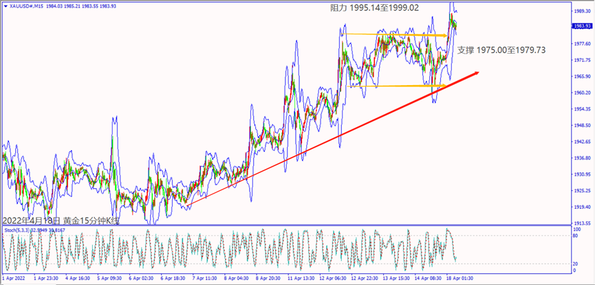 日级别线图,长下影线阴烛回测5日均线,1980关口若突破,有望延续涨势;15分钟K线,短线形成盘涨,守住前波盘整顶部,大有可能挑战上方阻力。