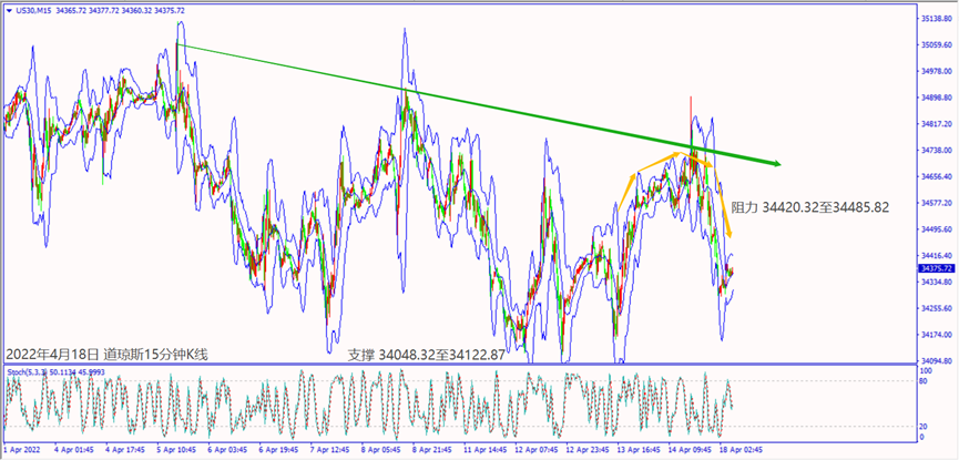 日级别线图,出现避雷针反转,一旦跌破60日均线,可能延续跌势;15分钟K线,出现圆形顶反转,布林带上轨线冲不过,大有可能下探支撑。