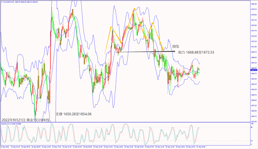 昨天(20日)受到美元指数大涨影响,造成黄金价格跌至1665美元附近整理。预期今天(21日)市场预期美联储利率决议宣布加息利好美元上涨,黄金价格一旦跌破小时布林带下轨线1661美元,建议可短空操作。