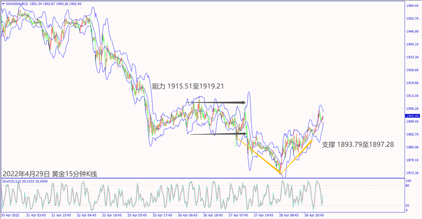 日级别线图,破底反弹重回1890关口,一旦突破5日均线,可能延续上涨;15分钟K线,出现V型反转,前波盘整底部若突破,大有可能挑战起跌阻力。
