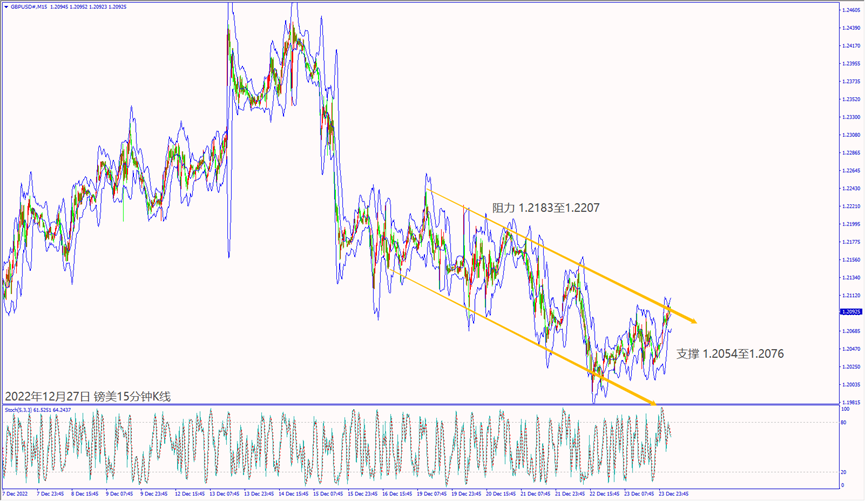 日级别线图,上影线阳烛未破前低,KD出现金叉,有望止跌反弹;15分钟K线,短线下降矩形,一旦突破趋势线,大有可能挑战起跌阻力。