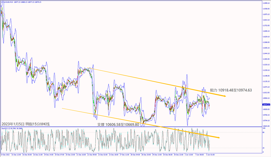 昨天(4日)美联储官员预期持续加息,造成道琼斯和纳指急跌约1%。周四(5日)清晨美联储会议纪要表示减缓加息,也让道琼斯和纳指反转上涨收复跌势。预期今天欧元区公布PPI数据下降,德指若守住小时布林带下轨线14,409,建议可短多操作。预期今天美国经济数据大都不佳,纳指若掼破5日均线10,906,建议可短空操作。