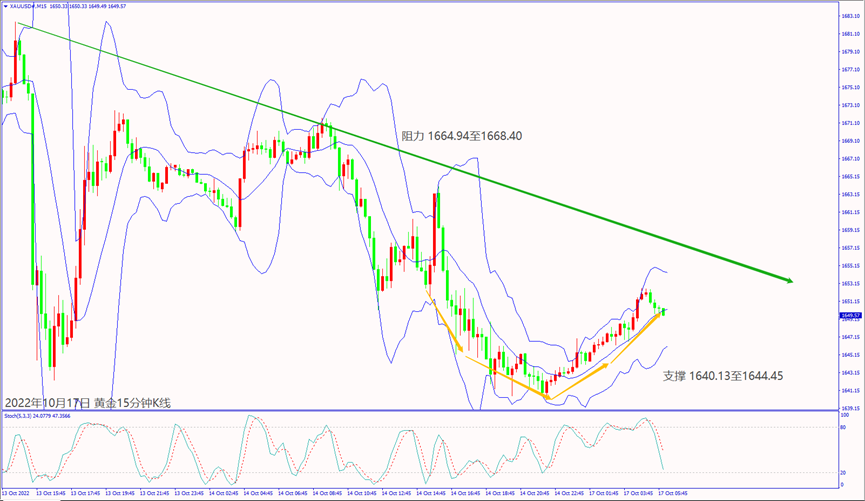 日级别线图,长阴烛回测前低价格,守住1640关口,有望挑战5日均线;15分钟K线,圆形底反转,一旦突破下降趋势线,大有可能挑战上方阻力。