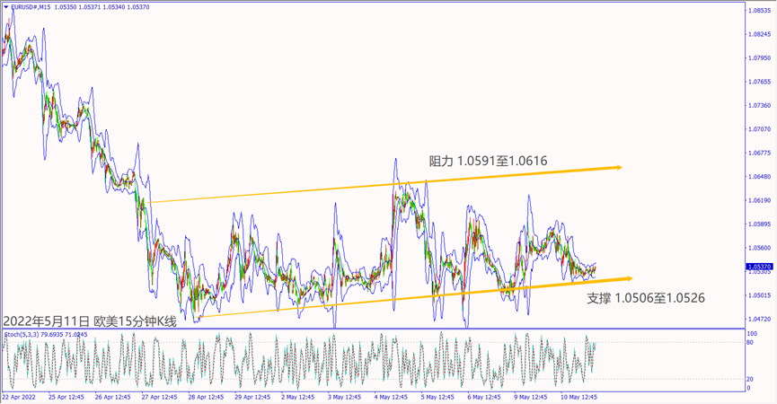 日级别线图,近期在1.0500关口上盘底,一旦突破5日均线,可能出现反弹;15分钟K线,短线出现上升矩形,守住趋势线,大有可能挑战前高阻力。