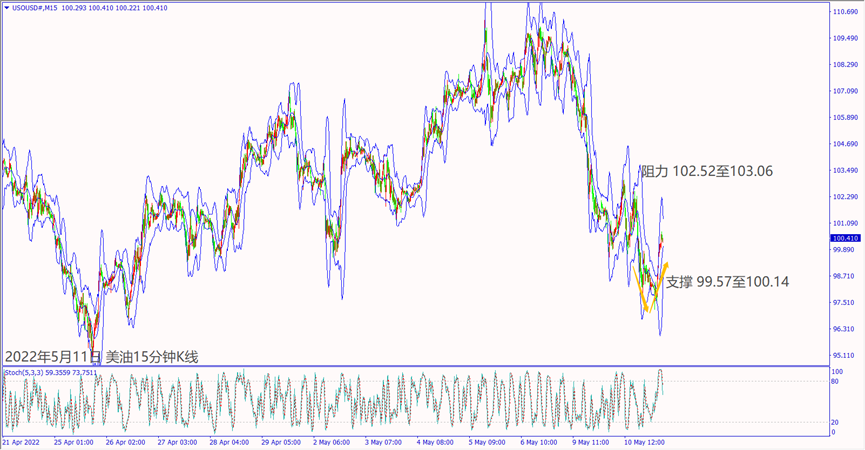今天(11日)清晨美国公布EIA月度能源报告调降今年石油需求,造成美油价格扩大下跌逾4%。预期欧盟今明两天可能投票通过禁止对俄罗斯石油进口,美油价格一度突破小时布林带上轨线100.97美元,建议可短多操作。