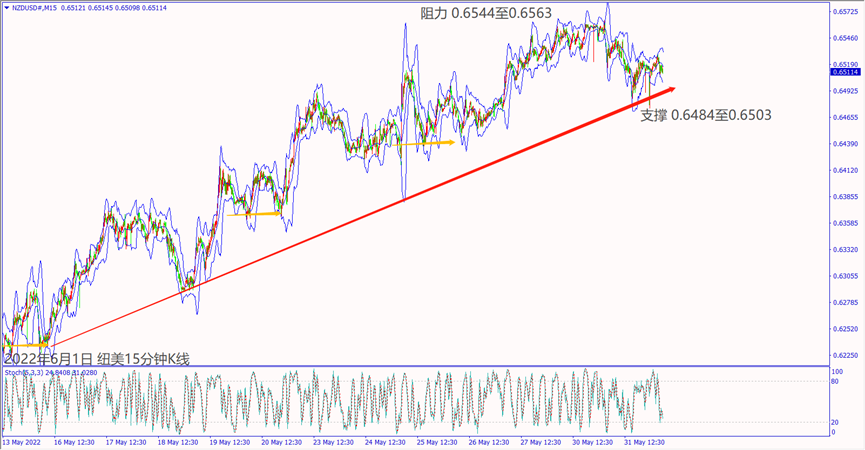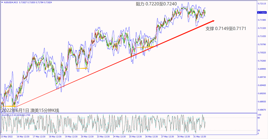 日级别线图,近两天在0.7150附近震荡,守住5日均线,有望延续涨势;15分钟K线,短线形成盘涨,守稳上升趋势线,大有可能挑战上方阻力。
