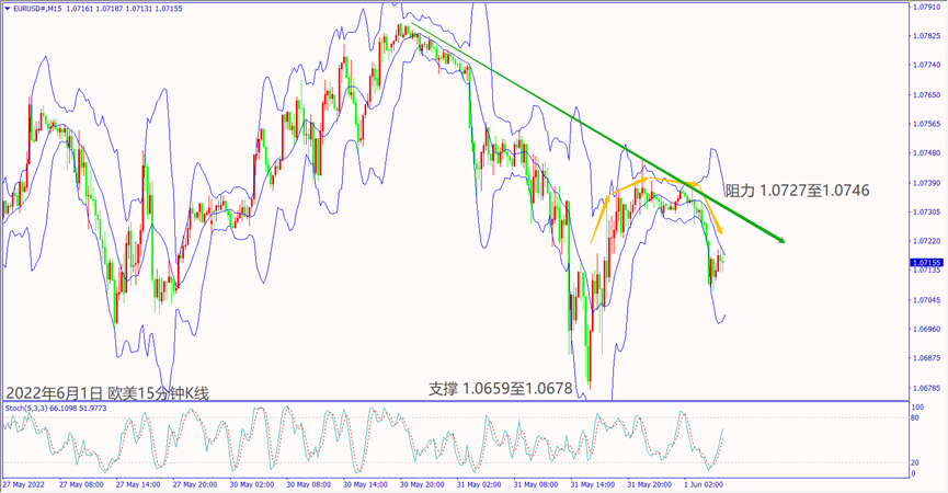 日级别线图,下影线阴烛受阻60日均线,5日均线冲不过,可能回测10日均线;15分钟K线,出现圆形顶反转,下降趋势线反压,大有可能下探支撑。