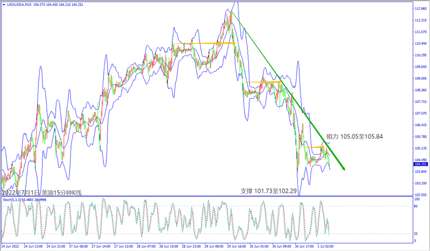 昨天(30日)欧美公布经济数据大都不佳,欧美股指下跌拖累美油价格跌逾4%。预期今天(1日)欧美公布制造业数据大都不佳,美油价格若跌破小时布林带下轨线103.87美元,建议可短空操作。