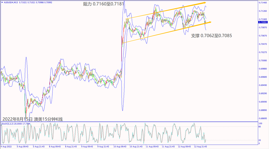 上周五(12日)美国公布物价指数下降和消费者信心指数利好,带动道琼斯和纳指扩大上涨逾1%。欧洲各国出现干旱和能源不足问题,预期今天(15日)德指若跌破小时布林带中轨13,833,建议可短空操作。预期今天美国公布经济数据大都利好,纳指若守住小时布林带下轨线13,486,建议可短多操作。