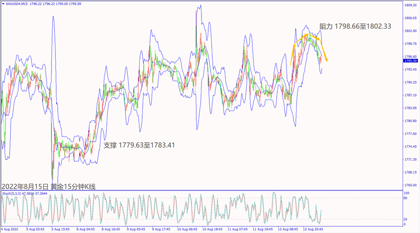 日级别线图,近四天在1800附近震荡,5日均线若掼破,大有可能回测1780美元;15分钟K线,圆形顶反转,1800.00关口冲不过,大有可能下探支撑。