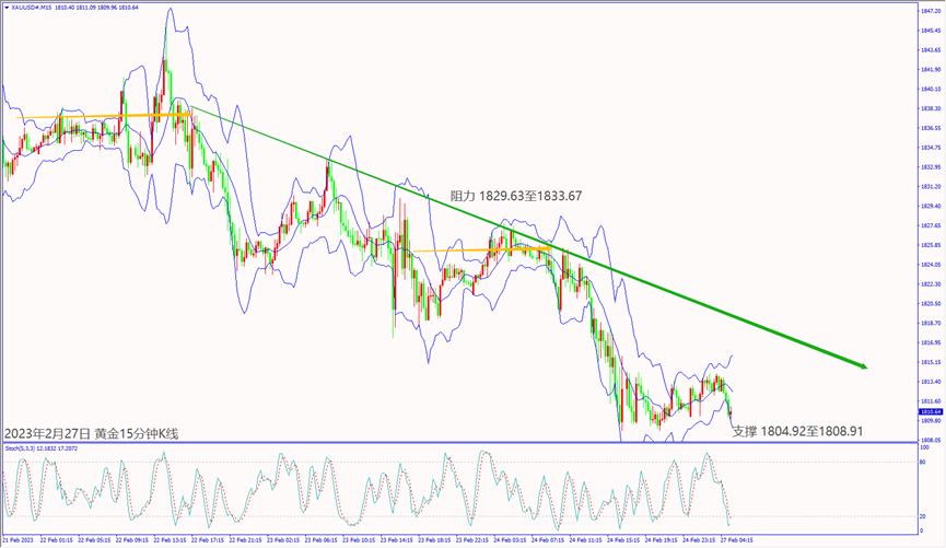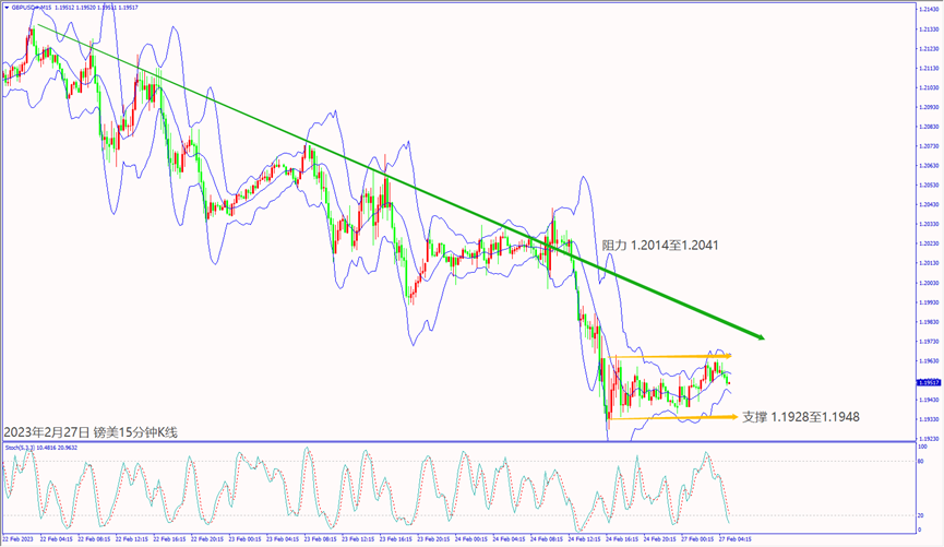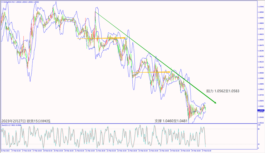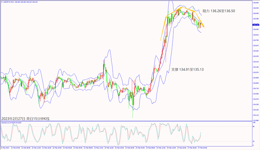 预期今天(27日)日本央行行长提名在参议院听证跟上周五讲话内容相同,美日反弹冲不过小时布林带中轨136.29,建议可短空操作。预期今天欧元区公布经济数据大都不佳,欧美一旦跌破小时布林带下轨线1.0535,建议可短空操作。预期今天美国公布经济数据大都不佳利淡美元,镑美一旦突破小时布林带上轨线1.1965,建议可短多操作。