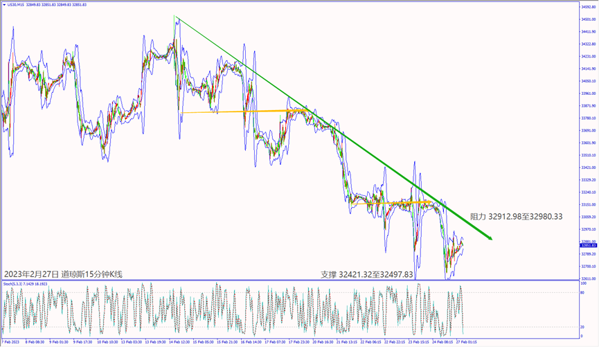 上周五(24日)欧元区经济数据利淡,以及美国公布经济数据利好加息,造成欧美股指一度下跌近2%。晚间美国消费者信心指数利好,推升道琼斯和纳指反弹。预期今天(27日)欧元区经济数据大都不佳,德指冲不过小时布林带上轨线15,306,建议可短空操作。预期今天美国公布经济数据大都不佳,道琼斯一旦跌破小时布林带下轨线32,724,建议可短空操作。
