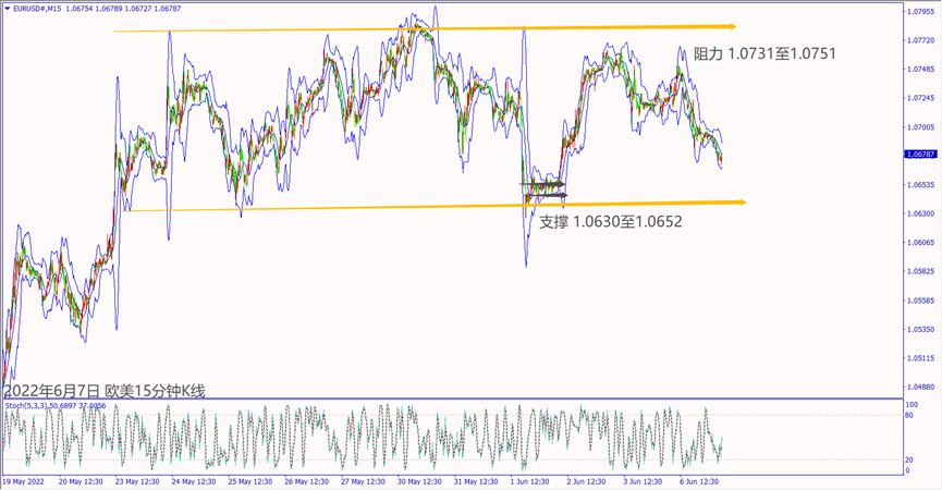 日级别线图,近期在1.0700关口附近震荡,一旦突破5日均线,可能挑战60日均线;15分钟K线,短线在1.0630~1.0780区间震荡,守住盘整底部,大有可能挑战上方阻力。