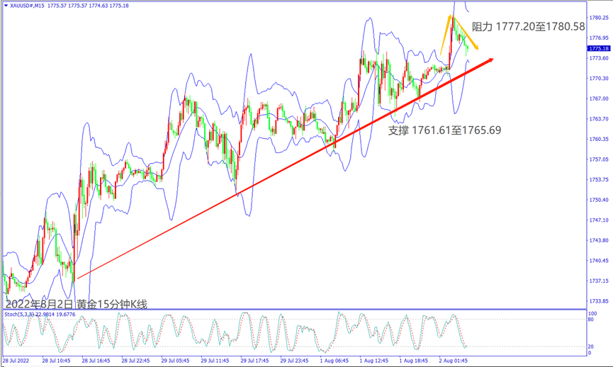 昨天(1日)美国经济数据好坏参半,但是猴痘疫情攀升造成美元指数创三周新低,市场买盘带动黄金价格上涨约15美元,尾盘守在1770关口附近整理。穆迪预测美联储在年底前将上调利率基准,预期今天(2日)美元指数出现反弹,黄金价格若跌破小时布林带中轨1773,建议可短空操作。