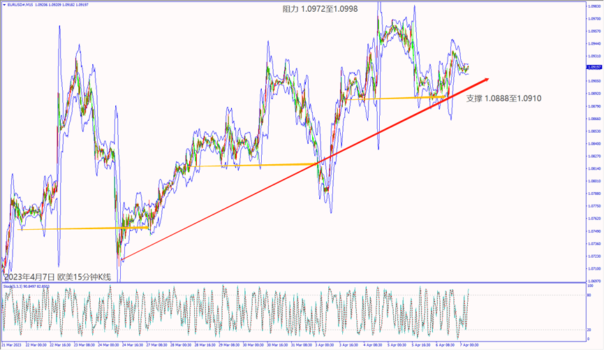 日级别线图,纺锤线阳烛重回5日均线,移动均线多方排列,有望延续涨势;15分钟K线,维持盘涨走势,守住上升趋势线,有机会挑战前高阻力。