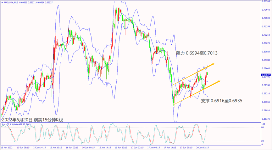 日级别线图,近期在0.6900关口上方震荡,5日均线若突破,可能重回涨势;15分钟K线,短线出现上升矩形,守住趋势线,大有可能挑战起跌阻力。