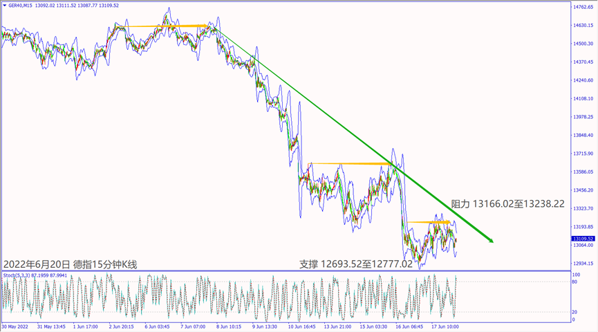 上周五(17日)美国四巫日造成道琼斯和纳指出现剧烈震荡,尾盘小幅度拉升下,利好纳指收阳和道琼斯收复当日跌势。预期今天(20日)欧洲央行行长拉加德提到加息抑制通胀,德指冲不过5日均线13,213,建议可偏空操作。预期今天受到欧洲股指下跌影响,道琼斯一旦跌破小时布林带下轨线29,778,建议可偏空操作。