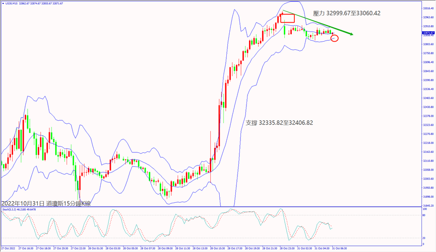 上週五(28日)美國公佈PCE物價利淡加息,道瓊斯和納指擴大上漲超3%。預期今天(31日)歐元區公佈CPI數據攀升利淡股指,德指一旦跌破小時布林帶中軌13,286,建議可短空操作。預期今天美國公佈經濟數據利好股指,道瓊斯若守住小時布林帶下軌線32,709,建議可短多操作。