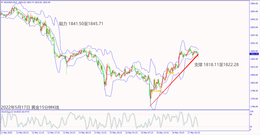 日级别线图,长下影线阳烛收复前日跌势,一旦突破5日均线,可能持续反弹;15分钟K线,短线形成盘涨,守住1820关口,大有可能挑战起跌阻力。
