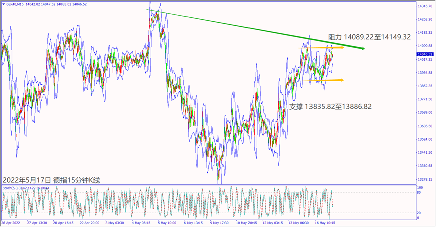 昨天(16日)英国央行行长贝利和美联储官员对抑制通胀来维护经济,一度带动道琼斯和纳指逆势上涨,但是受到美国制造业数据利淡影响尾盘皆下跌做收。预期今天(17日)欧元区公布经济数据大都不佳,德指一旦跌破30日均线13,990,建议可偏空操作。预期今天美国公布零售销售数据不佳,纳指若跌破5日均线12,158,建议可偏空操作。