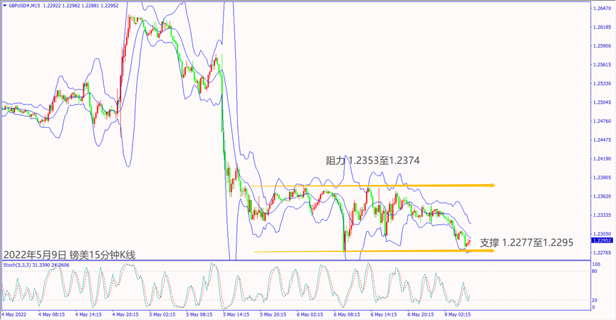 日级别线图,长下影线阴烛,守住1.2300关口,可能出现反弹;15分钟K线,短线出现区间震荡,守住盘整底部,大有可能挑战前高阻力。