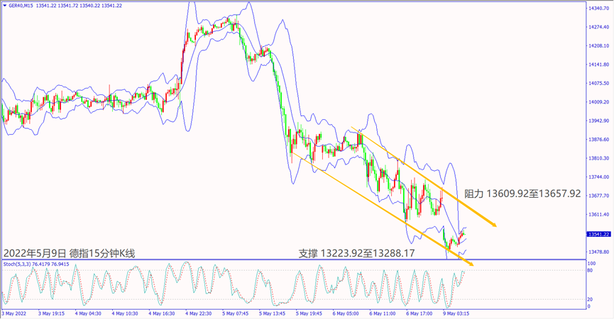 上周五(6日)美国公布经济数据好坏参半,造成美国股指处于震荡。但乌克兰总统泽连斯基称目前与俄罗斯进行沟通的所有外交渠道都中断了,也让欧美股指皆下跌做收。预期今天(9日)欧元区公布经济数据不佳,德指冲不过小时布林带中轨13,623,建议可偏空操作。预期今天晚上美国公布经济数据不佳,道琼斯冲不过小时布林带中轨32,626,建议可偏空操作。
